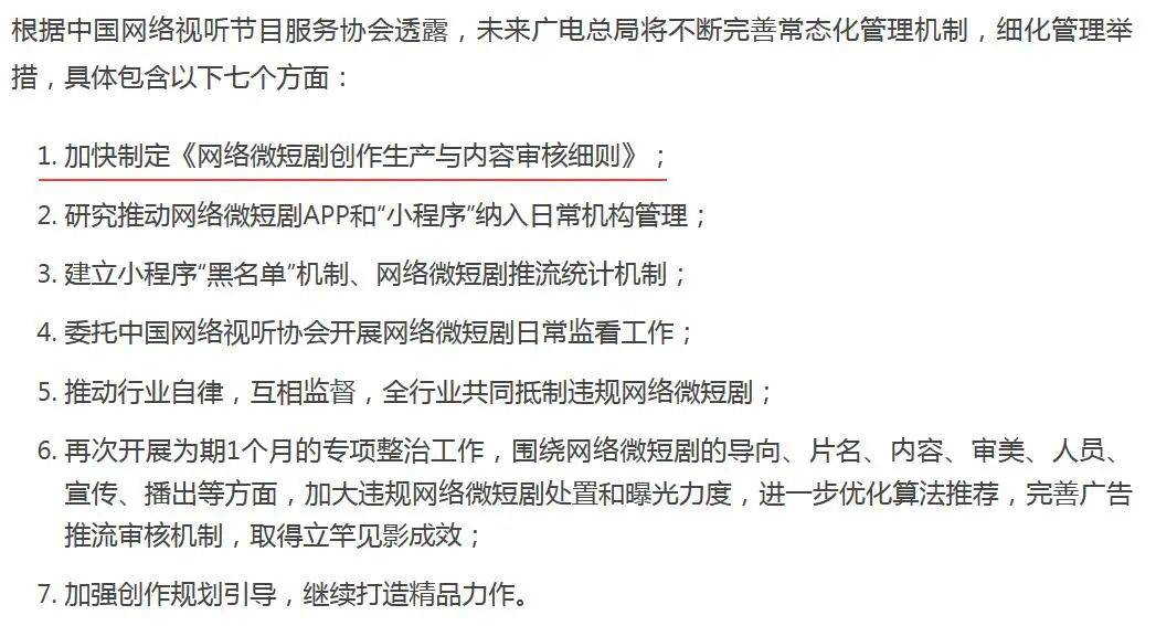 最新消息是今年11月15日,据相关报道,广电总局将再次开展为期1个月的网络微短剧专项整治工作并提出了七个方面的整改意见,其中最醒目的是第一条意见:加快制定《网络微短剧创作生产与内容审核细则》。