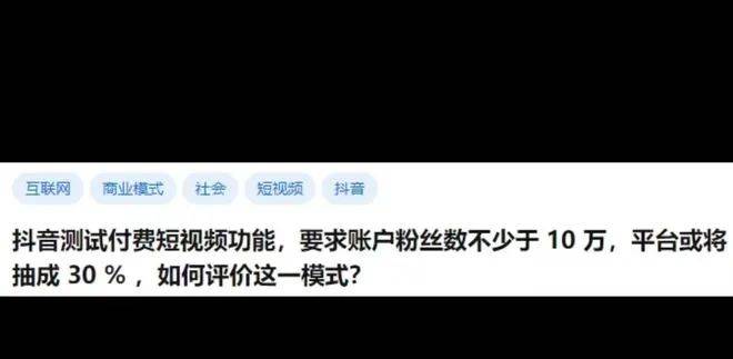 另一方面,据界面新闻等报道,抖音本体也在11月开启了针对短视频的付费测试,并将付费内容由此前试水的短剧扩展到科普、娱乐等所有短视频内容。该功能由创作者自行设置开启,抖音将从中抽取30%服务费。