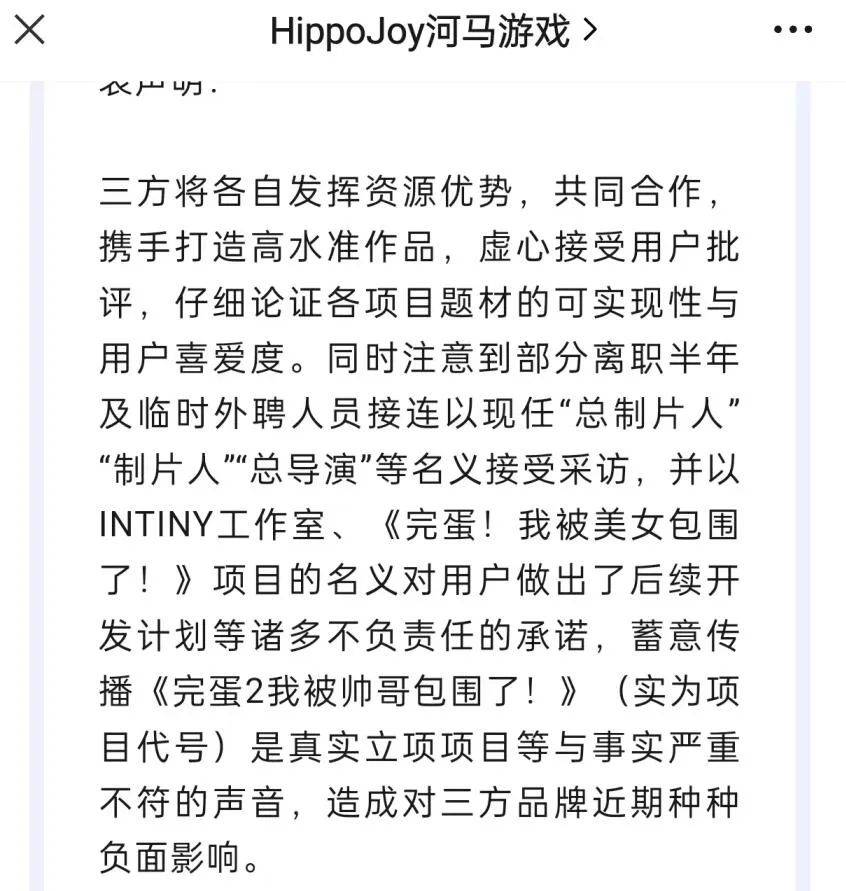 随后在11月9日,河马游戏再发布公告称与中手游达成合作,准备结合“仙剑”IP制作《天呐!我被仙剑包围了》(暂定名),还拉到小米作为联合出品方。在公告中,河马游戏表示此前的《完蛋2!我被帅哥包围了!》实为项目代号,并非真实立项项目,并对外界的一些传言进行了辟谣。