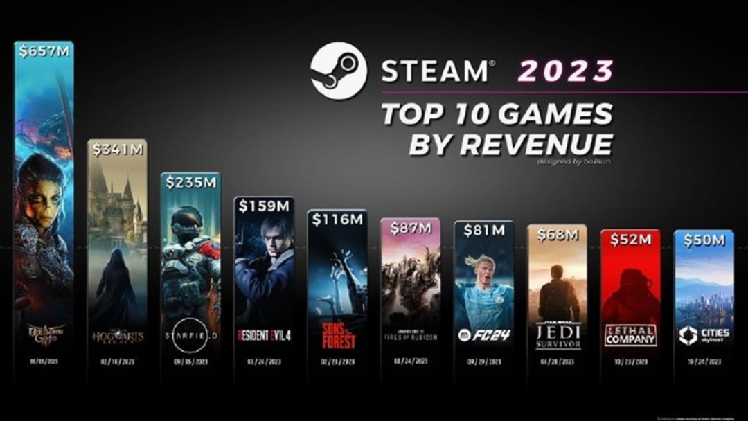 分析机构VGI发布了其推算的2023新作年度收入榜单,《博德之门3》以6.57亿美元位列第一。此外,排名第9的《致命公司》由21岁开发者Zeekerss单人制作。据玩家估算(以该榜单数据为基础),抽去Steam平台和Unity引擎分成,他起码可以获利3640万美元。