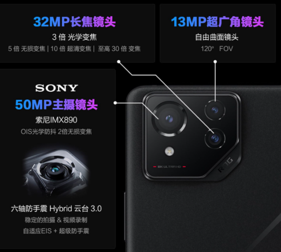 旗舰级影像系统成为ROG 8系列的一大亮点,前置3200万像素镜头,后置5000万像素IMX890大底主摄,辅以1300万像素超广角自由曲面镜头,带来更清晰、更细腻的成片效果。