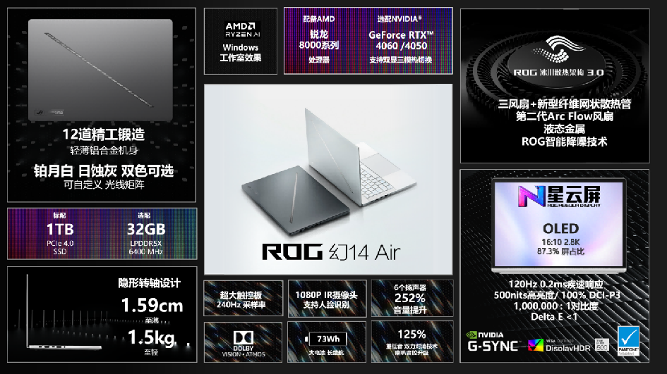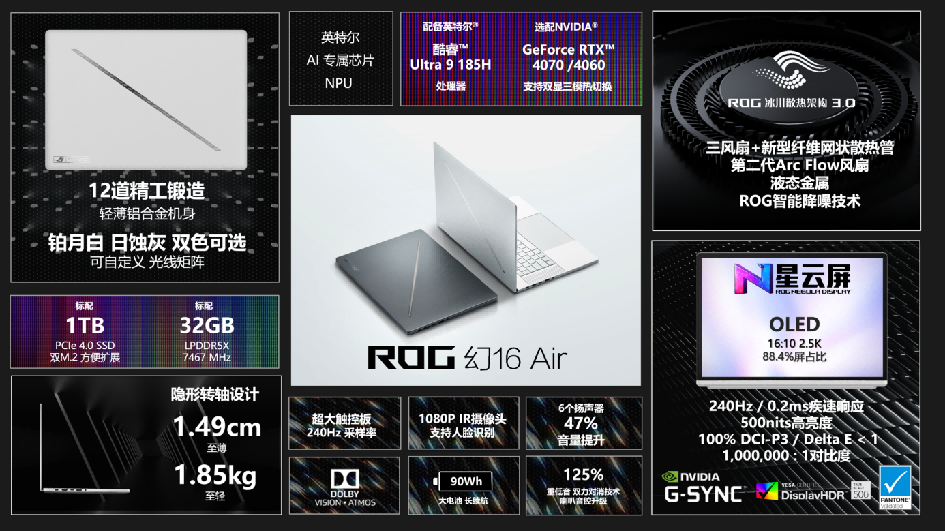 ROG幻16Air则搭载英特尔酷睿Ultra9 185H、GeForceRTX 4070/4060笔记本电脑GPU。搭载16:102.5K 240Hz星云屏,覆盖100%P3色域,DeltaE<1。内置90Wh大容量电池,6扬声器,支持杜比视界及杜比全景声。轻约1.85kg,薄至14.9mm,堪称16英寸最强创作轻薄本。