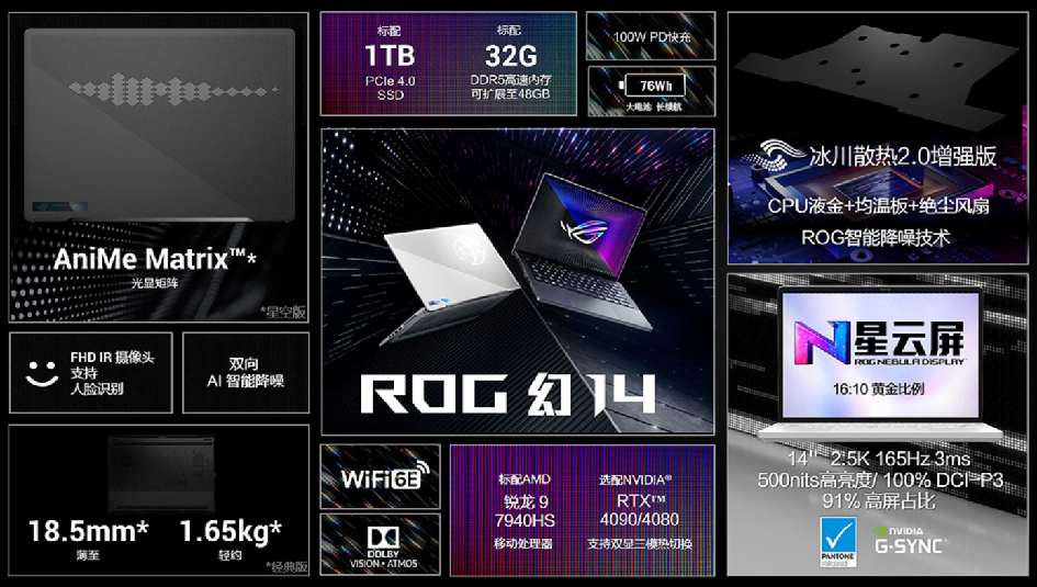 如何在有限的空间内,赋予创作者最强悍的性能,14英寸的潮酷轻薄全能本ROG幻14星空版/经典版两款新品给出了答案。配置上,相比上一代幻14,图形显示核心大幅升级。幻14可选配旗舰级NVIDIAGeForce RTX4090/4080笔记本电脑GPU,拥有16GB和12GB超大显存,游戏性能和AI算力均大幅提升。支持DLSS3.5、光线追踪及双显三模显卡热切换功能。存储同样升级到16GB×2DDR5内存及1TBPCIe 4.0 SSD,内存容量一步到位,创意表现再进阶。两款产品均搭载AMD锐龙97940HS高性能移动处理器。散热上,冰川散热架构2.0增强版,包括液金导热介质、双绝尘风扇、均温板结合,将热量高速导出。显示方面,搭载14英寸2.5K星云屏,拥有165Hz刷新率、3ms响应时间、500nits亮度、100%DCI-P3色域覆盖。两款产品均标配76Wh电池,支持100WPD快充。