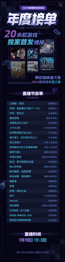 2023年哔哩哔哩游戏区年度榜单将于2024年1月19日晚19点直播揭晓。今日官方正式发布了直播的完整节目单,超过20款单机主机游戏将会提供最新情报和视频内容,其中《完蛋!我被美女包围了!》DLC还将带来独家首曝PV。