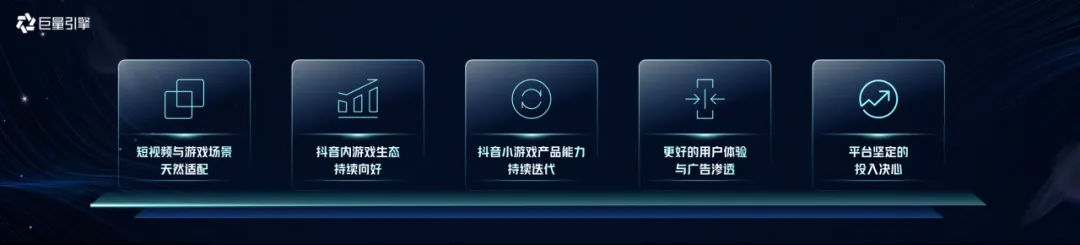 其中,抖音侧边栏成为用户留存的关键路径,其渗透率环比增长88%,侧边栏已经成为用户主要复访场景,启动用户变现率仅次于广告;而抖音搜索关键词是开放给开发者的SEO能力,如今已成为免费获量的最大场景,搜索带量环比上涨53%;抖音好友分享(IM)渗透率20%+,其高活跃用户和抖音小游戏用户匹配度极高,头部游戏IM免费流量月均五百万;最后,游戏推荐卡与游戏短视频混排,着力于抖音最大流量场景的用户精准召回。