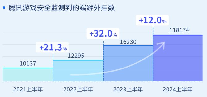 游戏外挂问题一直是行业级难题。2024年上半年,腾讯游戏安全监测到PC端游戏外挂数为18174款,同比增长12%。在PC端游戏外挂样本中,射击类游戏(FPS+TPS)占比最高,其次是动作类游戏(ACT),此外还有多人在线战术竞技类游戏(MOBA)和大型多人在线角色扮演类(MMORPG)。
