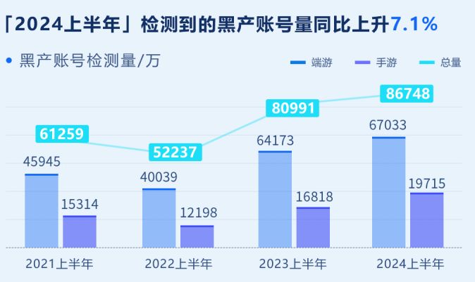 2024年上半年,腾讯游戏安全检测到的黑产账号量约为8.67亿(次),腾讯游戏安全处罚的黑产账号量约为6737万个。其中端游黑产账号处罚量同比上升3.8%,上升量为123万;手游黑产账号处罚量同比上升156.2%,上升量为2049万。