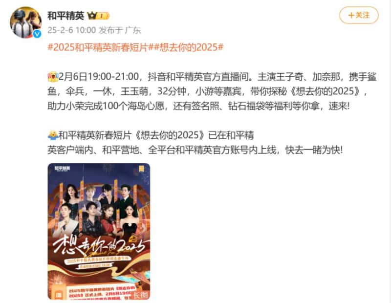 回顾今年春节,《和平精英》凭借丰富的版本内容和专业的宣推手段,上线六年依然能在除夕当日实现超8000万的日活量。 而《想去你的2025》的创新探索,又彰显出《和平精英》向前的步伐不会停歇。