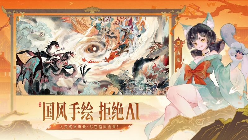 《指间山海》以《山海经》中光怪陆离的神话世界为基底,构建了一个跨越时空的东方志怪宇宙。游戏采用动态水墨画风,全角色手绘立绘,将鲲鹏展翅的磅礴、九尾狐的妖娆、孙悟空的灵动展现得淋漓尽致,赋予每个幻灵独特的情感张力。玩家将在游戏中体验到“考据式创作”带来的文化沉浸感,从角色设计到技能设定,都深深根植于中华传统文化。