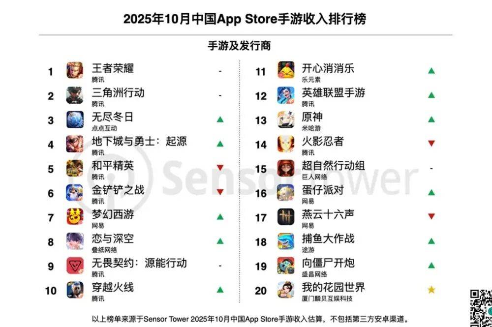 从本期财报数据可以看出,长青游戏依然是腾讯游戏重要的增长引擎。今年以来,腾讯多款大DAU游戏的市场表现都很突出。据SensorTower统计,2025年10月中国手游收入排行榜前10位中,腾讯游戏就占据7席。而这样的霸榜几乎已经成为腾讯今年的常态。