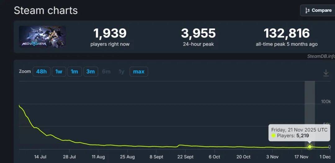 然而游戏上线之后不到一个月的时间,玩家在线人数就出现断崖式下滑,跌到不足万人。9月19日,游戏S1赛季上线。尽管制作组做了很多努力,推出了新的机甲,上线新玩法,调整了平衡机制,还参加了今年的TGS、AGF等展会加大自己的声量,想通过“听劝”人设来挽回人气,但效果并不明显。