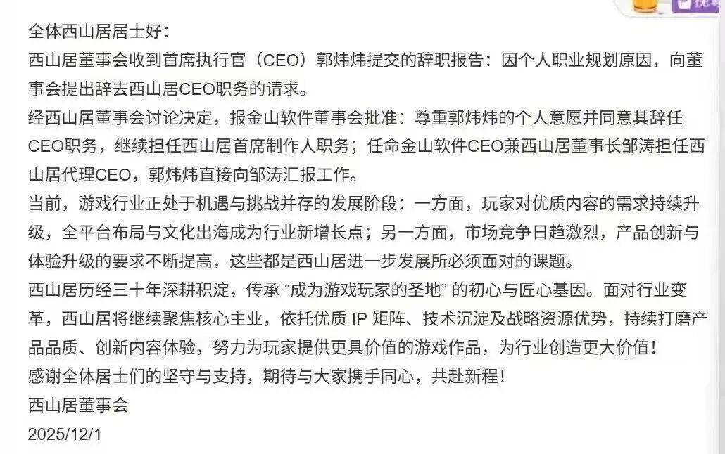 昨日,西山居曝出重大人事调整。据一封内部信显示,现任CEO郭炜炜因个人原因提出辞去西山居CEO职务。董事会同意其辞任CEO,继续担任西山居首席制作人,同时任命金山软件CEO兼西山居董事长邹涛担任代理CEO。郭炜炜直接向邹涛汇报工作。