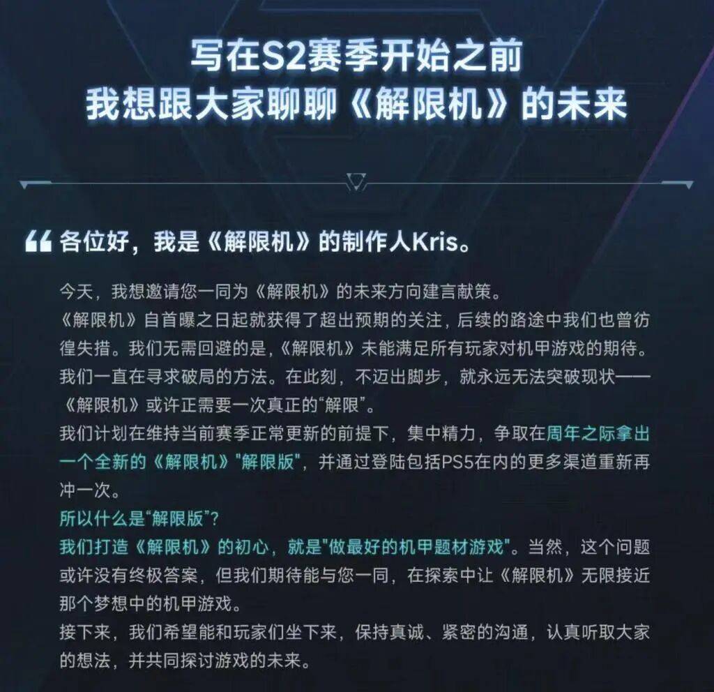 然而,这封公开信已经有点画饼的意思。信中所谈的“全新内容”指的是游戏半周年(春节)及之后的内容更新,而S2赛季本身的内容更新量很少,仅有一些新的机体推出以及战令等更新,并无新玩法或新模式登场。