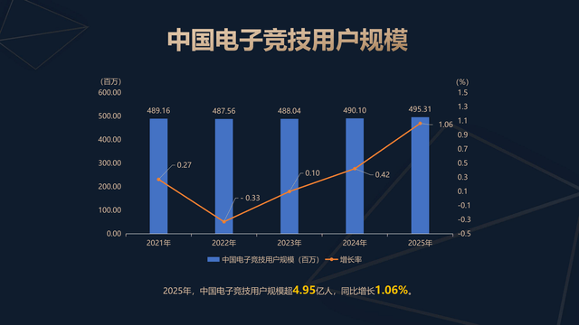 2025年,中国电子竞技用户规模超4.95亿人,较去年增长明显,增长率为1.06%。