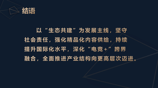 展望未来,在“十四五”收官、“十五五”即将开启的关键阶段,中国电子竞技产业将以“生态共建”为发展主线,坚守社会责任,推动产业健康有序发展;强化精品化内容供给,提升产业核心竞争力;持续提升国际化水平,深化全球产业合作;深化“电竞+”跨界融合,拓展场景协同边界,全面推进产业结构向更高层次迈进。