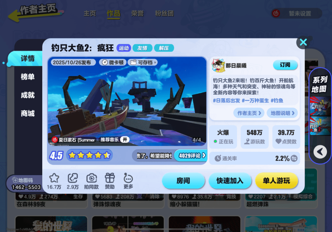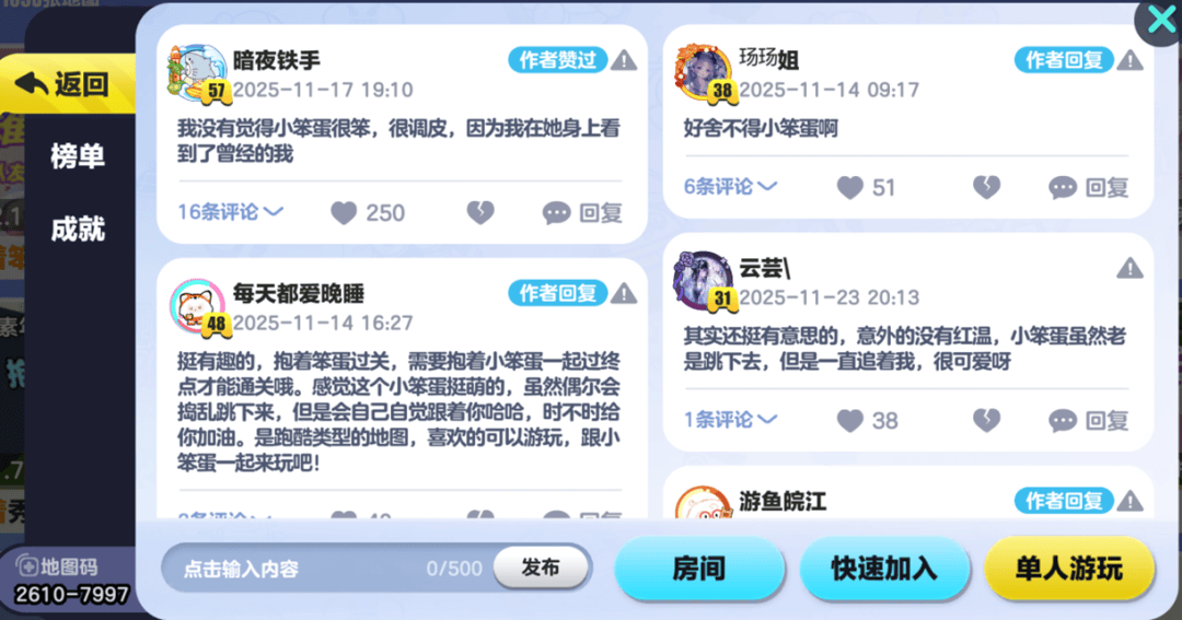 如果对得上玩家的胃口,还能收获额外的一些打赏收益。“蛋仔乐园的榜单,很大程度反映了玩家当前的喜好趋势,我们也时刻留意榜单的变化。社区内的热点同样值得关注,会让玩家产生意想不到的惊喜,比如‘噢!这个作者太懂我了,这图里居然有我最喜欢的蛋小黄!’”。