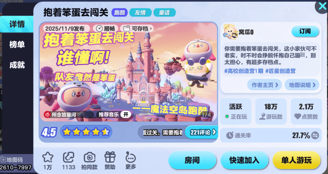 说“低风险”,是因为平台上很多受欢迎的地图偏向轻量、休闲和社交,单个地图的开发周期比较短,个人或小团队利用课余、业余时间就能完成一次完整的“立项-开发-发布”流程。即使不成功,付出的时间和精力成本也相对可控。