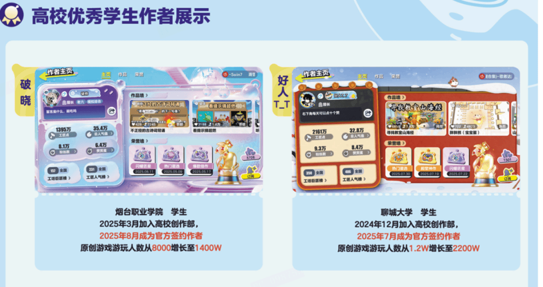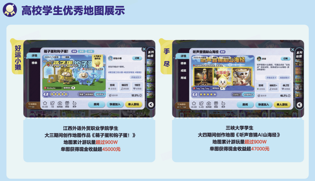 这种特性带来了非常实际的效果。有同学在校期间就能独立产出可玩的地图并进行市场测试;也有同学入行不到一年,便成为官方签约作者,游玩人数接近千万。