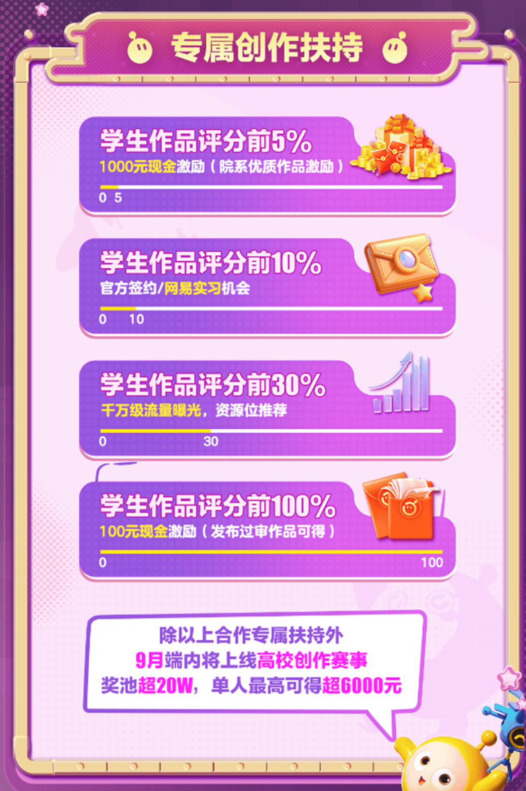 对于高校学生,平台有专门的扶持链路,包括现金奖励、网易实习机会等,帮助他们从学习阶段平稳过渡到独立创作变现。外加端内定期的高校地图赛事,收益还将进一步提升。