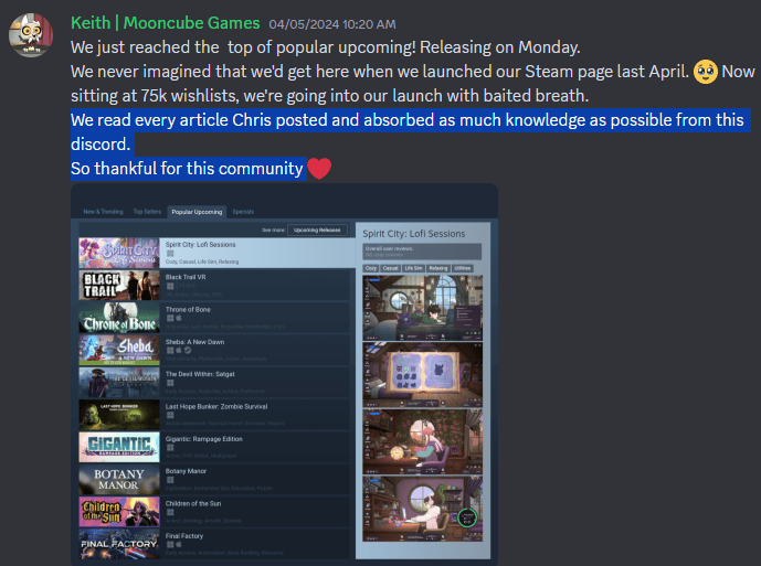 “在Next Fest活动中,我们获得了1.5万个愿望单。虽然最后两天促销活动的访问量并不高,但‘发现队列’弥补了这一缺口,昨天的访问量甚至超过了促销活动!希望发现队列能继续给我们带来好运……两周前我们也进行了大规模的推广,发布了新的预告片和发售日期公告,并与一些网红合作。”