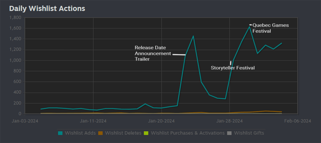 试玩版于2023年11月发布(如上图红色箭头所示),并一直持续到正式发售。在此期间,他们参加了所有能参加的游戏节,包括Storyteller Festival、魁北克游戏节和Game Devs of Color。