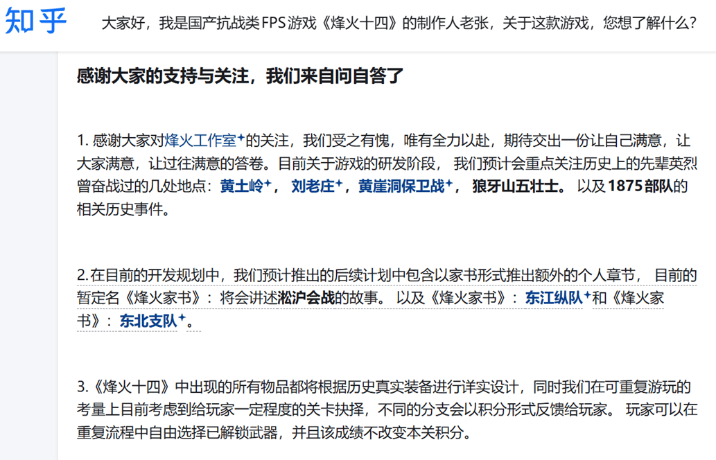 据团队透露,游戏流程估计在15小时左右,算不上太长,但别的不说,至少在演出上靠着cod这样的国际大作走了。团队也在知乎上表示会重点关注黄土岭、刘老庄、黄崖洞、狼牙山这些地点,且试玩demo预计在明年发布。