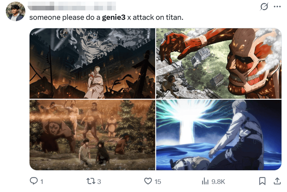 由于Genie3 现阶段并没有向全民开放,需要250美元/月门槛价,因此在网上我还看到有不少网友跃跃欲试,请求有资格的用户把动漫里的名场面做成游戏。还有不少网友说,要是把小说直接放进去,“头号玩家”不就成了?