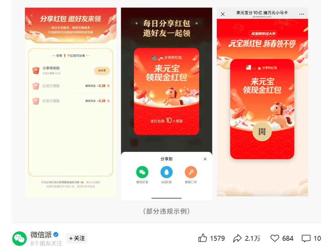 这种反应实在普遍,以至于元宝的这波活动还引来了大量用户反馈与投诉。2月4日,微信官方账号“微信派”发布《关于第三方诱导分享行为的打击公告》,“微信屏蔽元宝红包链接”这一话题也随即冲上热搜。