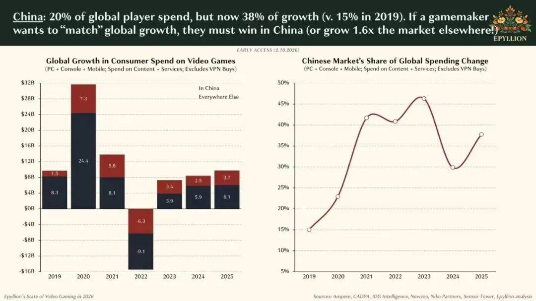 近日Epyllion公司的Matthew Ball发布《2026年视频游戏现状报告》,这应该算得上是2026年第一份比较重量级的全球游戏报告,而在这份报告里面,游戏矩阵也针对中国市场的表现进行了一个具体的整理,其中披露的全球及中国游戏市场关键数据,核心价值在于为我们精准洞察中国游戏市场的实际表现、厘清行业发展脉络,提供了极具参考价值的依据。