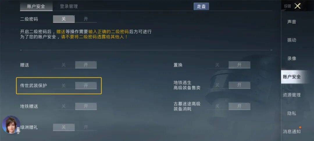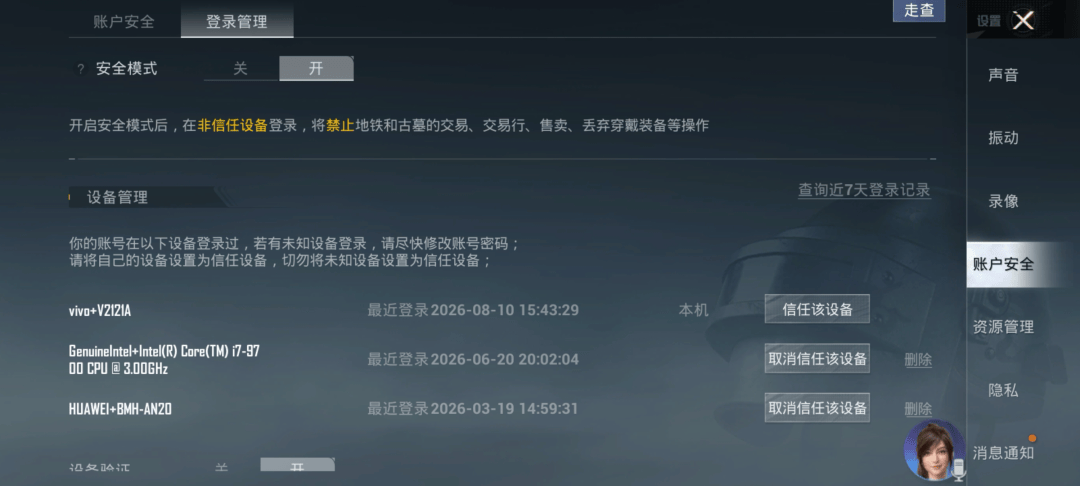 在安全模式开启的情况下,非信任设备将无法在“地铁逃生”和“古墓迷途”等玩法中进行资产的交易、售卖、分解、赠送、丢弃操作。
