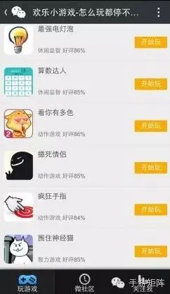 自从《神经猫》在朋友圈里面爆红之后,忽然感觉朋友圈里面多了无数的小游戏,而相比手机游戏来说,这种HTML5的游戏是更加简单粗暴,把微信变作一个游戏平台,然后在通过社交平台的力量进行传播,这就是当下最流行的一种手游趋势,如果说把APP的手游比喻成客户端游戏的话,而这种模式的游戏则成了页游的形式,这是手游的过渡还是下一个潮流呢?