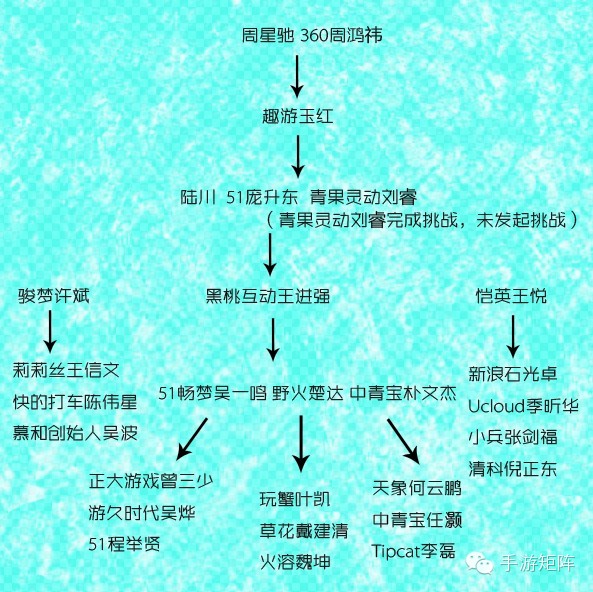 庞升东点名骏梦许斌、黑桃王进强、恺英王悦,然后游戏圈各位大佬立马应战,于是许斌点名莉莉丝王信文、快的打车陈伟星、慕和吴波;王悦点名新浪石光卓、Ucloud季昕华、小兵张剑福、清科倪正东;王进强点名51畅梦吴一鸣、野火楚达、中青宝朴文杰。