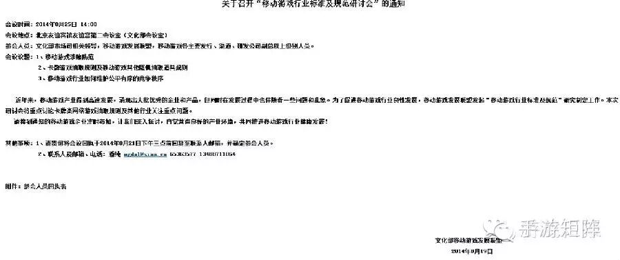 2014年8月,网络传言移动游戏发展联盟发布通知,将于8月25日在文化部举行“移动游戏行业标准及规范研讨会”重点讨论移动游戏涉赌防范、卡牌类网络游戏抽取规则及行业其他重点关注问题。