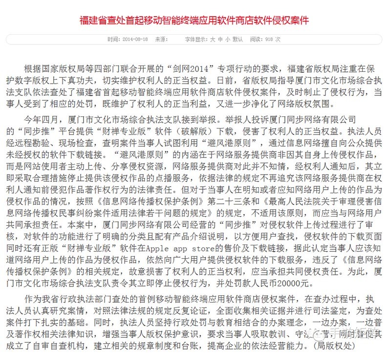 随后在日前,福建省版权局日前发布名为《福建省查处首起移动智能终端应用软件商店软件侵权案件》的公告,同步推提供“财禅专业版”软件(破解版)下载、侵害了权利人的正当权益,被罚20000元。执法人员经远程勘验、现场检查,查明案件当事人试图利用“避风港原则”,通过信息网络擅自向公众提供未经授权的软件下载链接。